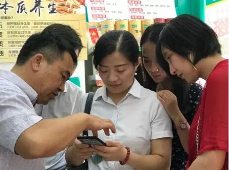 在考察健之家重慶勤康公司門店時,中寧縣枸杞產業(yè)發(fā)展服務局副局長、黨組副書記嚴立寧,向店員及消費者現(xiàn)場演示中寧枸杞追溯碼系統(tǒng)。